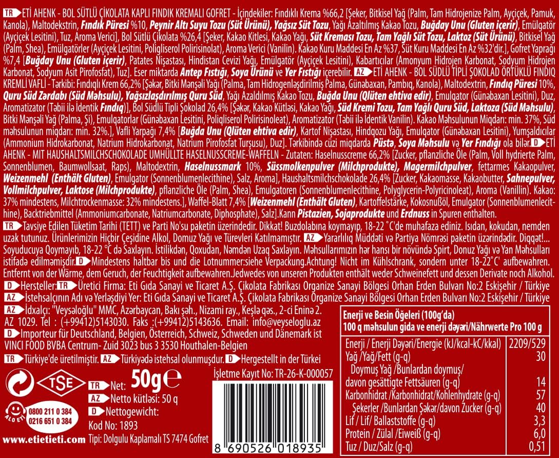 Erleben Sie die unwiderstehliche Kombination aus samtiger Haselnusscreme, knusprigem Waffel und zarter Milchschokolade in jedem Bissen von Eti Ahenkurme. Diese mundgerechten Leckereien sind ein zeitloser Klassiker, der für seinen unveränderten, köstlichen Geschmack geschätzt wird.